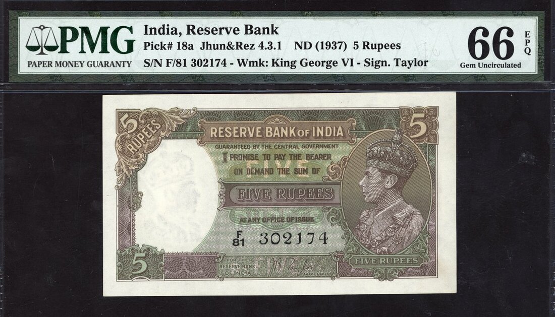 Reserve Bank of India, 5 rupees, ND (1937), serial number F/81 302174, brown and green, George VI at right, signature Taylor,