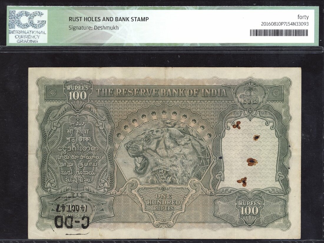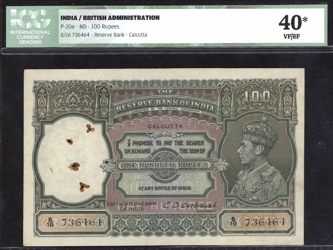 Reserve Bank of India, 100 rupees, Calcutta, ND (1943), serial number B/16 736464, purple and green, George VI at right, Deshmukh signature, reverse green, tiger head at centre