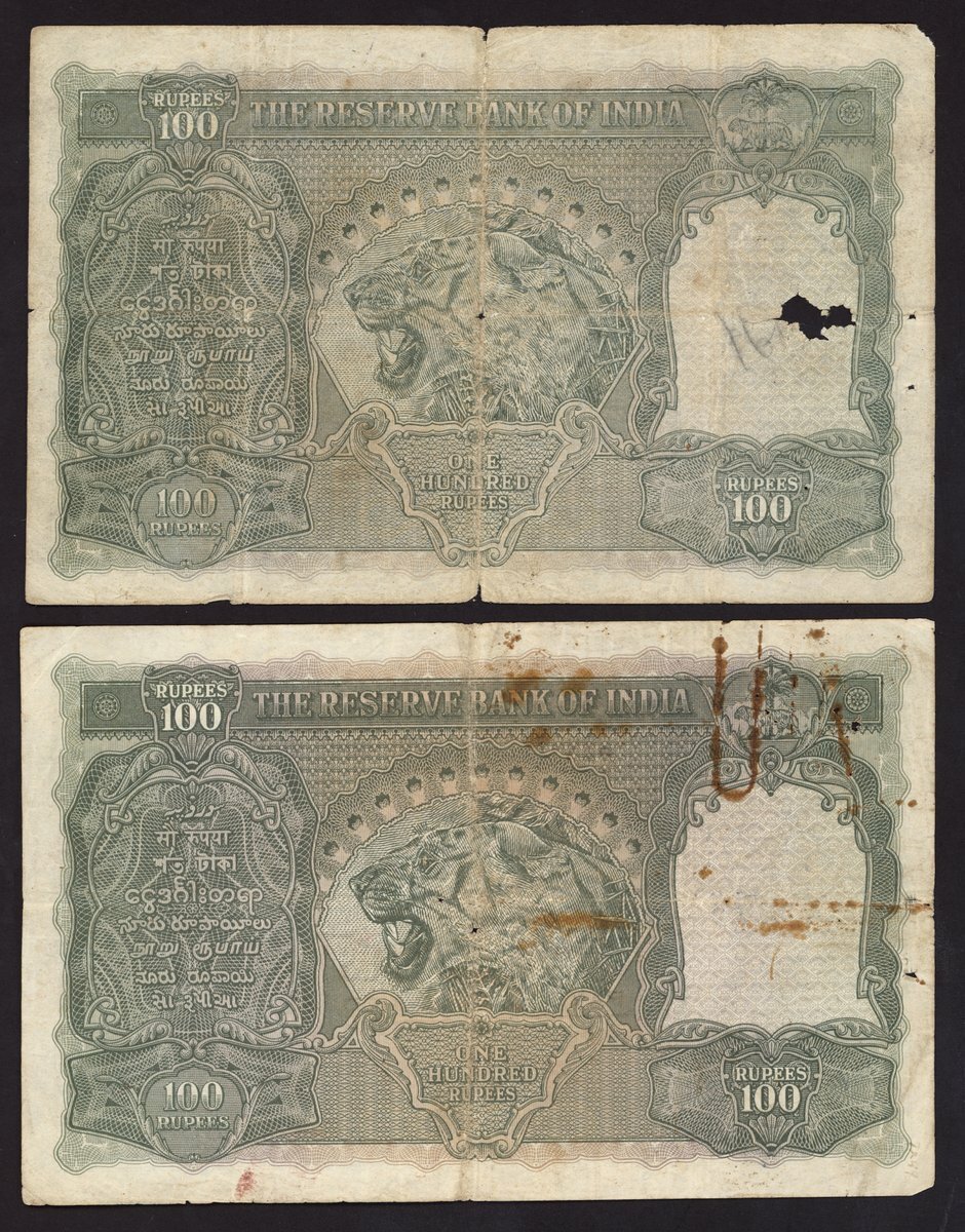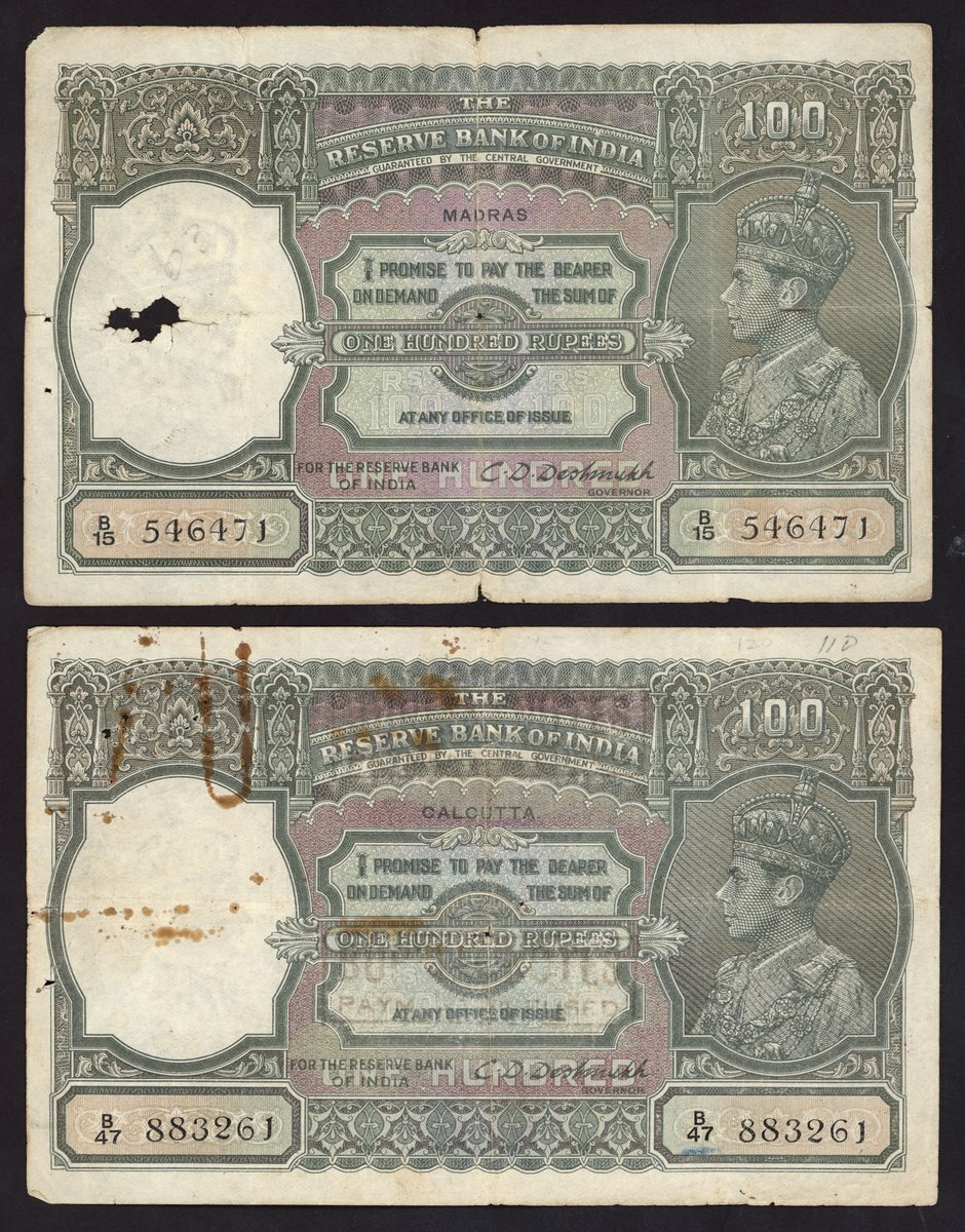 Reserve Bank of India, 100 rupees (2), ND (1938), Calcutta and Madras, prefixes B/47 and B/15, olive green, portrait King George VI at right, bank title top centre, Deshmukh signature, reverse, tiger at centre