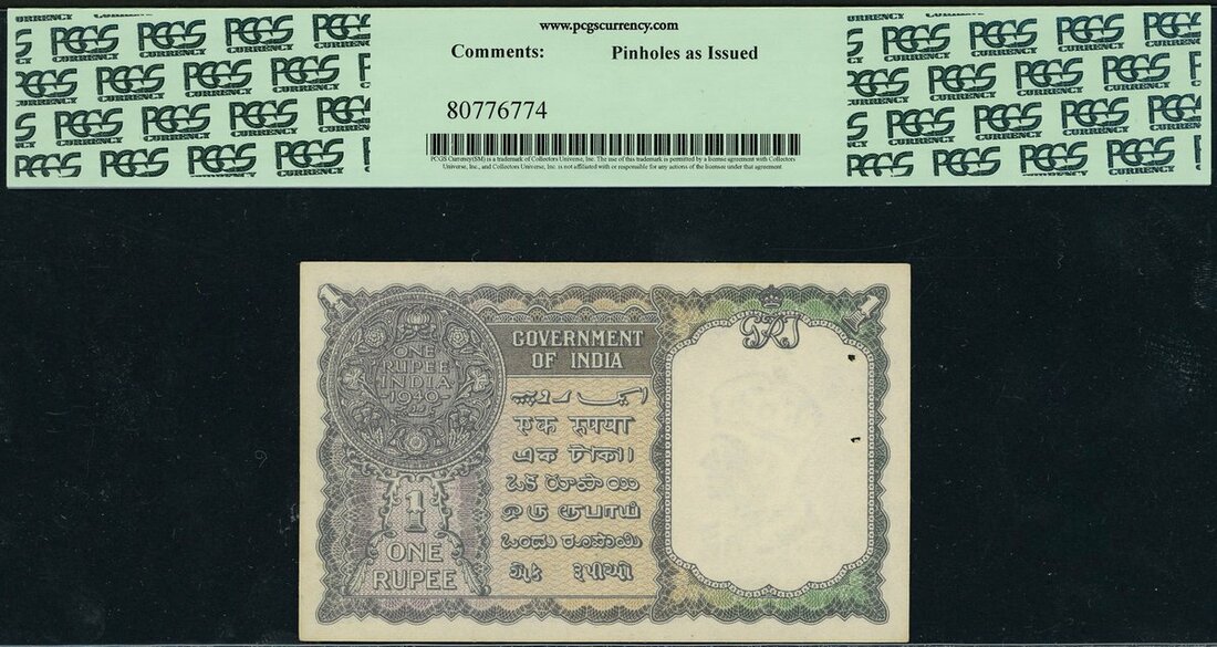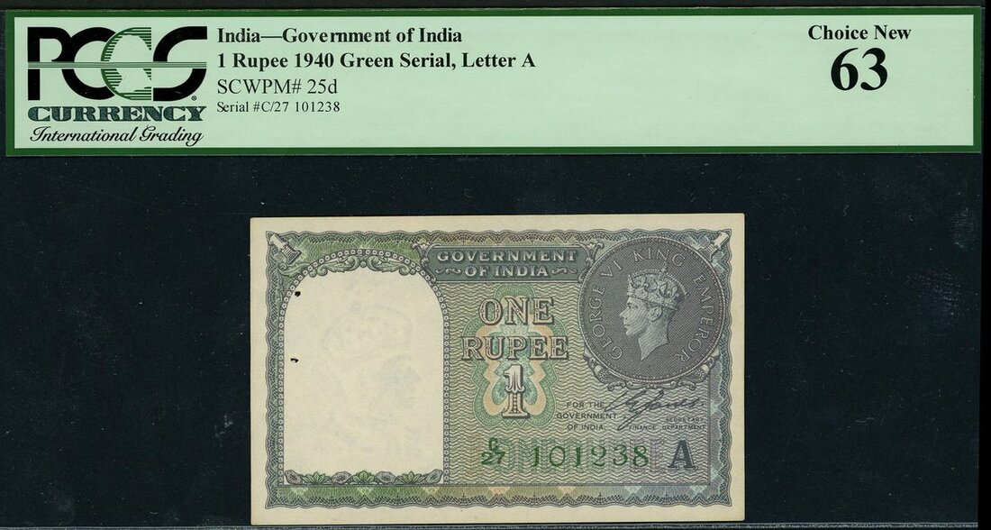 Government of India, 1 rupee, ND (1940), serial number C27 101238, (Pick 25d, TBB B151d), in PCGS holder 63 Choice New, pinholes at issue