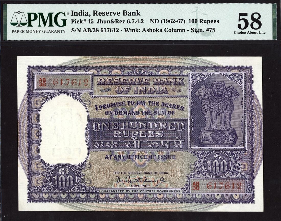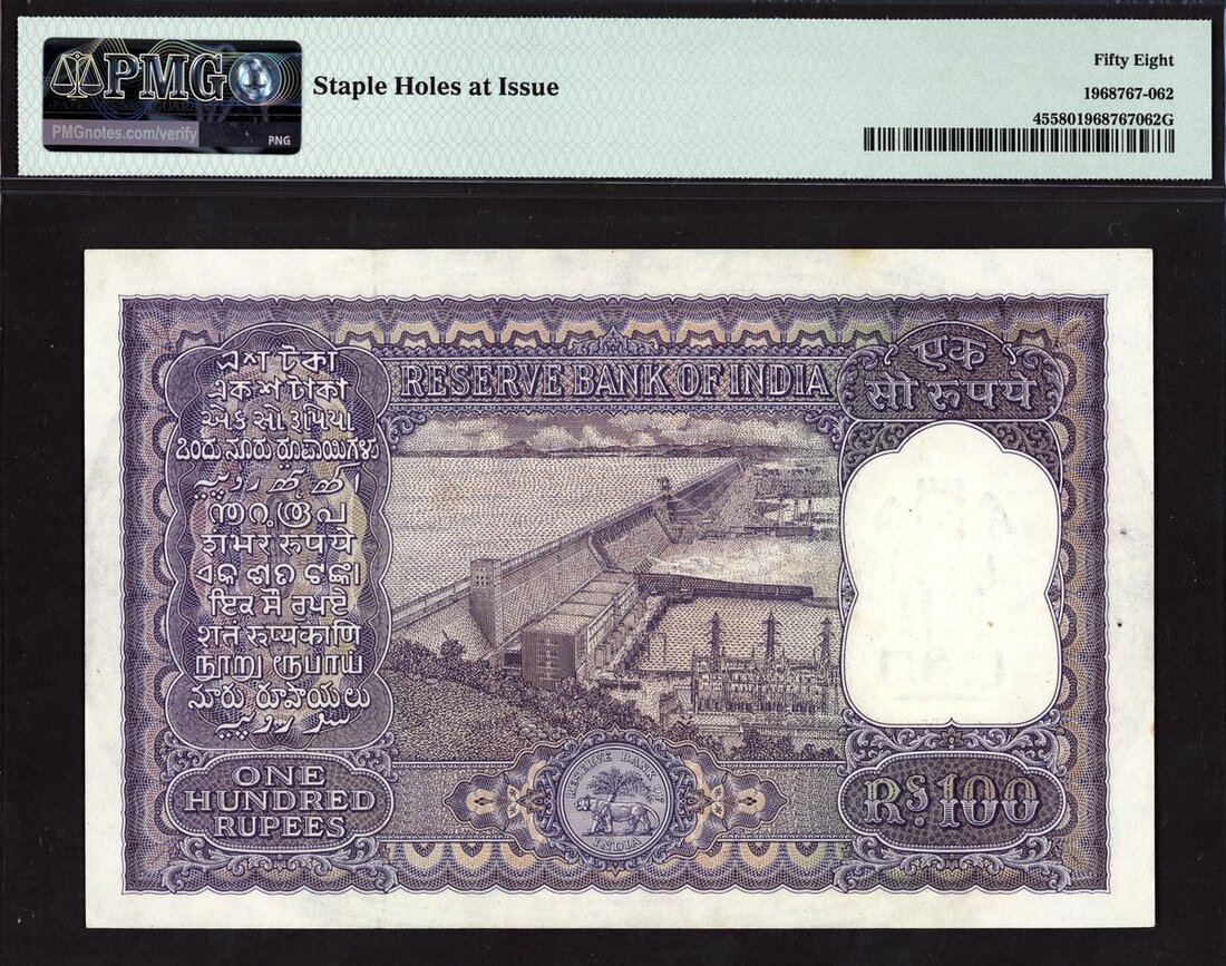 Reserve Bank of India, 100 rupees, ND (1962-67), serial number AB/38 617612, (Pick 45, Razack-Jhunjhunwalla 6.7.4.2), in PMG holder 58 Choice About Uncirculated, staple holes at issue