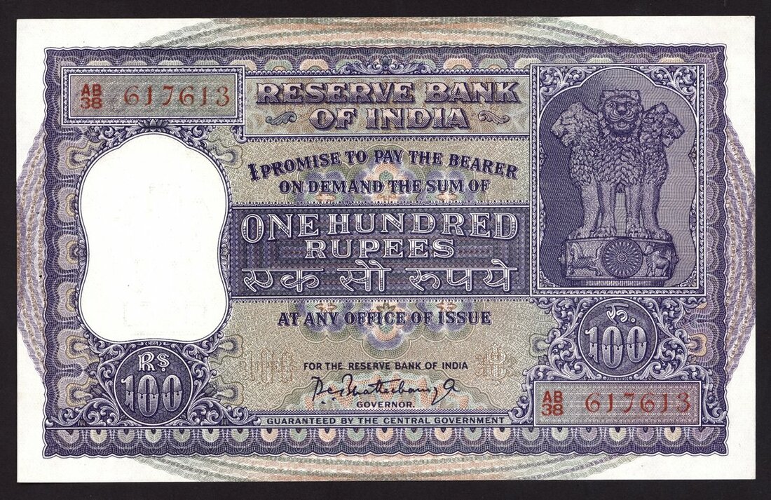 Reserve Bank of India, 100 rupees, ND, red prefix AB/38, purple, Ashoka column at right, Bhattacharyya signature