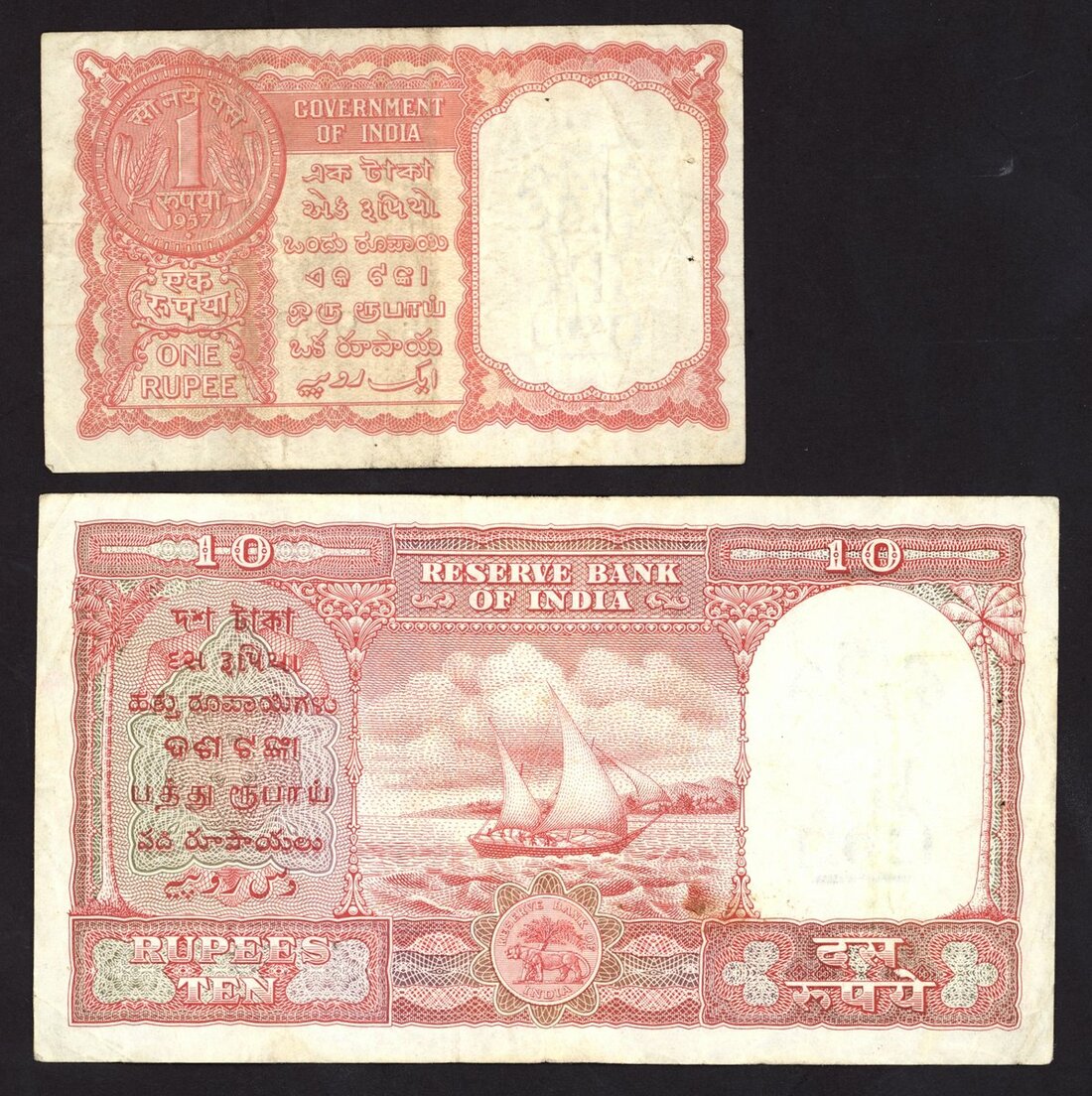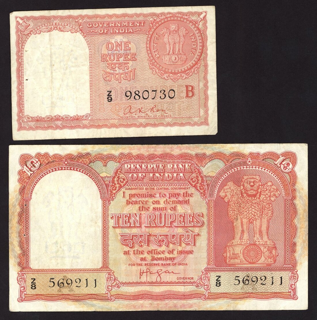 Persian Gulf issue, India Reserve Bank, 1 rupee, ND (1950's), prefix Z/9, red and 10 rupees, prefix Z/8, red, both Ashoka column at right, Roy/Lengar signatures respectively