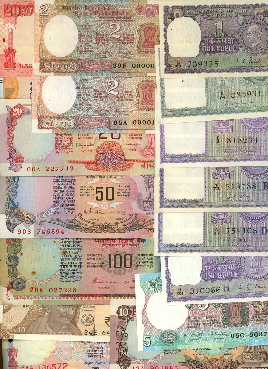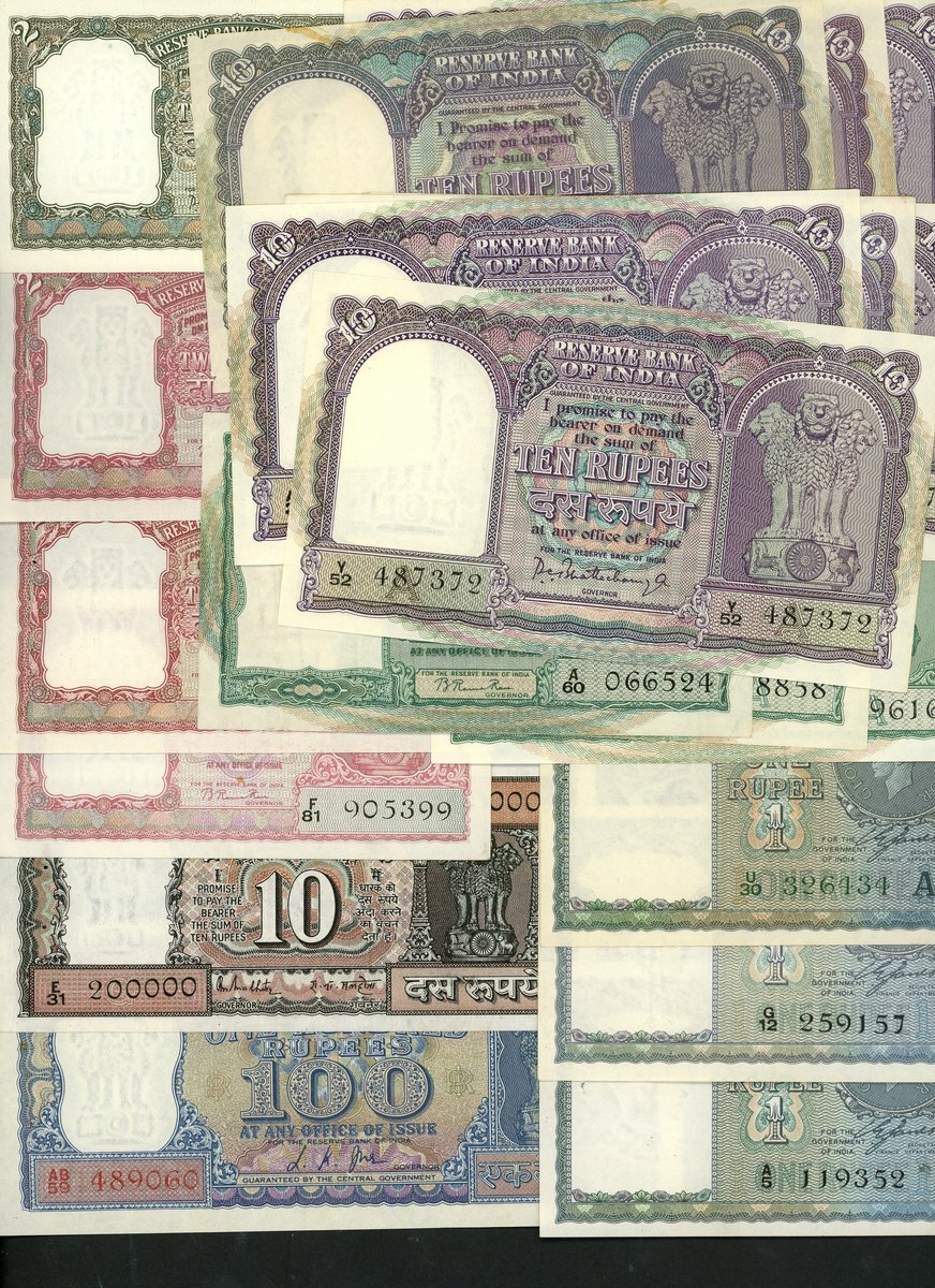 Reserve Bank of India, a varied selection of the more modern issues comprising Geoege VI 1 rupee (3), 2 rupees (4), 5 rupees (3), 10 rupees (7), also a fairly comprehensive selection of later issues including 100 rupees (2) (Pick 62b, 70b) and 2 rupees (2) with serial number 05A 000010 and 39F 000001 (Pick 79)