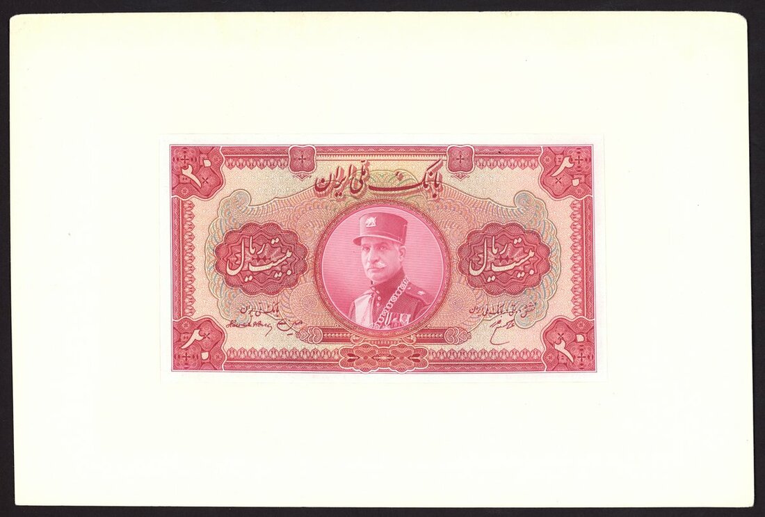 Bank Melli Iran, proof obverse 20 rials, 1932/1933, red and pale green and pink, Shah Reza at centre, reverse red