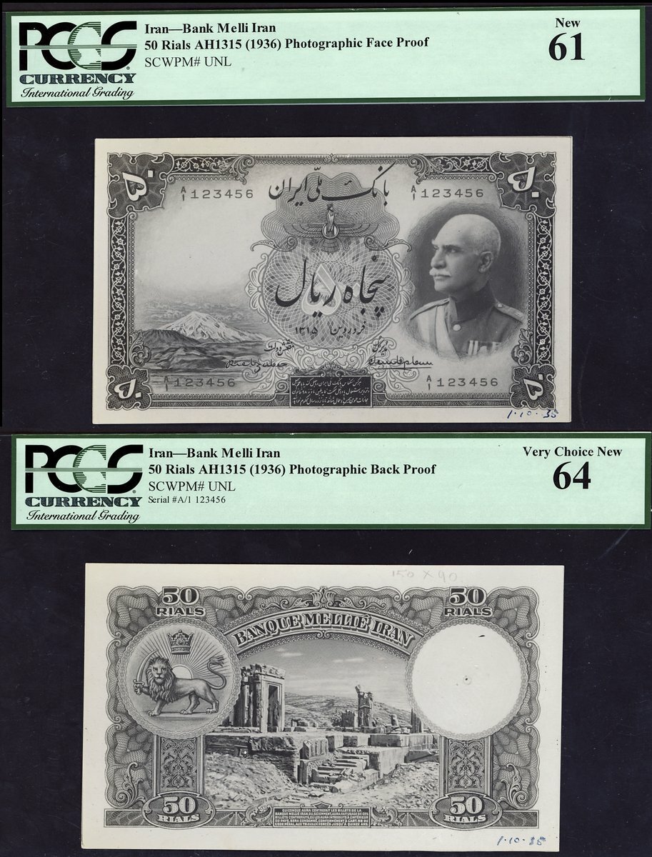 Bank Melli Iran, obverse and reverse archival photographs for an unissued 50 rials, AH1315 (1936), black and white, Reza Shah at right, Mount Damavand at left, reverse, arms at left, ruins of Darius Palace in Persepolis,