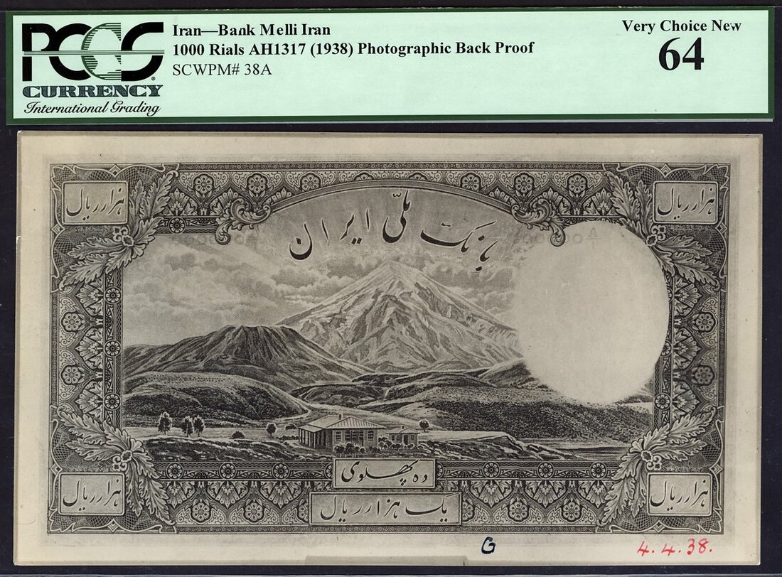 Bank Melli Iran, obverse and reverse archival photographs for a 1000 rials, AH1313 (1939), black and white, Reza Shah at right, reverse, Mount Damavand,
