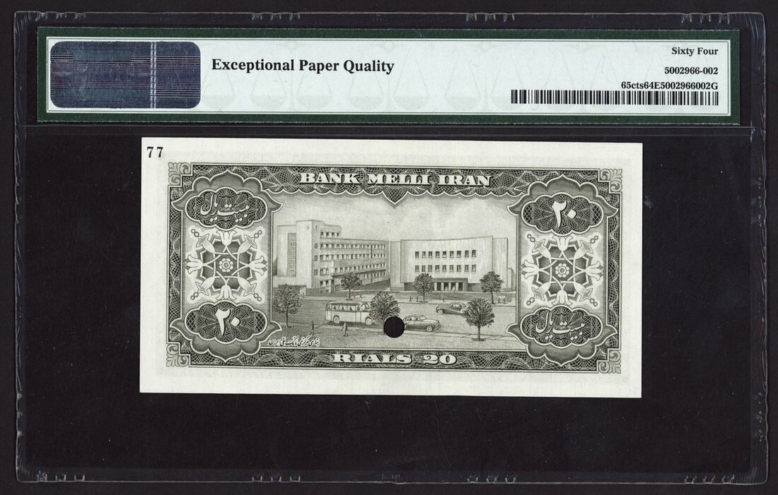 Bank Melli Iran, colour trial specimen 20 rials, ND (1954), red Farsi serial number, olive green (instead of brown), Farsi text, Darius the Great stabbing Ahriman monster from stone relief at Persepolis at left, Mohammad Reza Shah Pahlavi, reverse, English and Farsi text, Bank Melli Iran new headquarters building at centre, solid yellow security thread