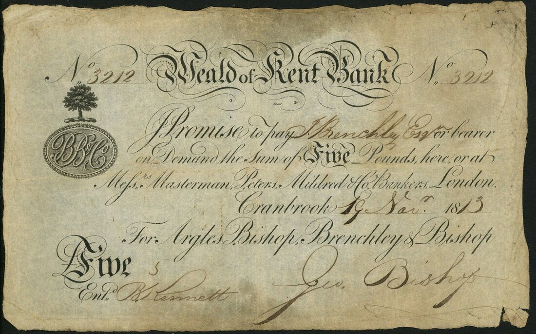 Weald of Kent Bank, (Argles Bishop, Brenchley & Bishop), £5, 19 November 1813, serial number 3212, (Outing 608c), very good, presentable example