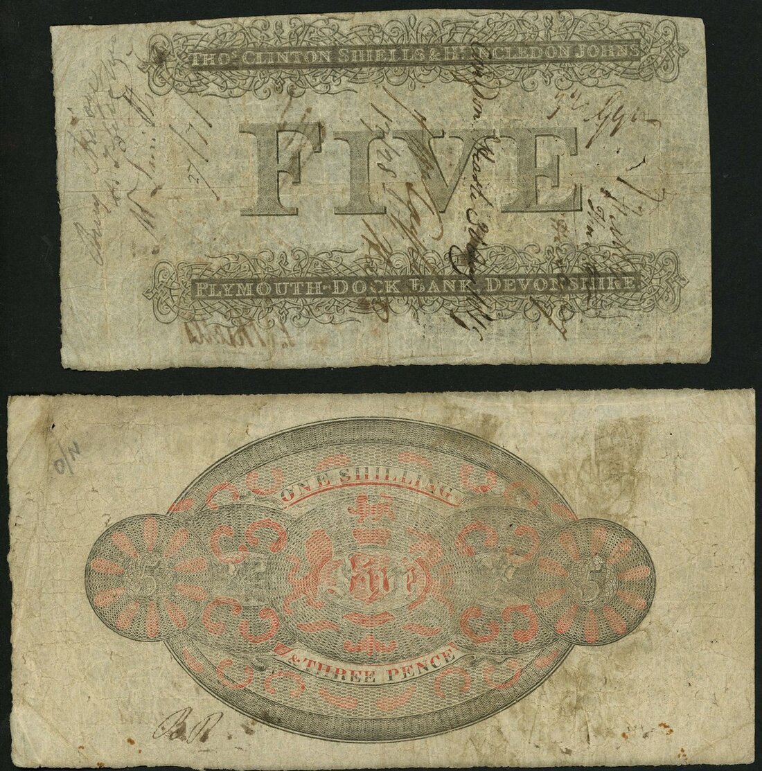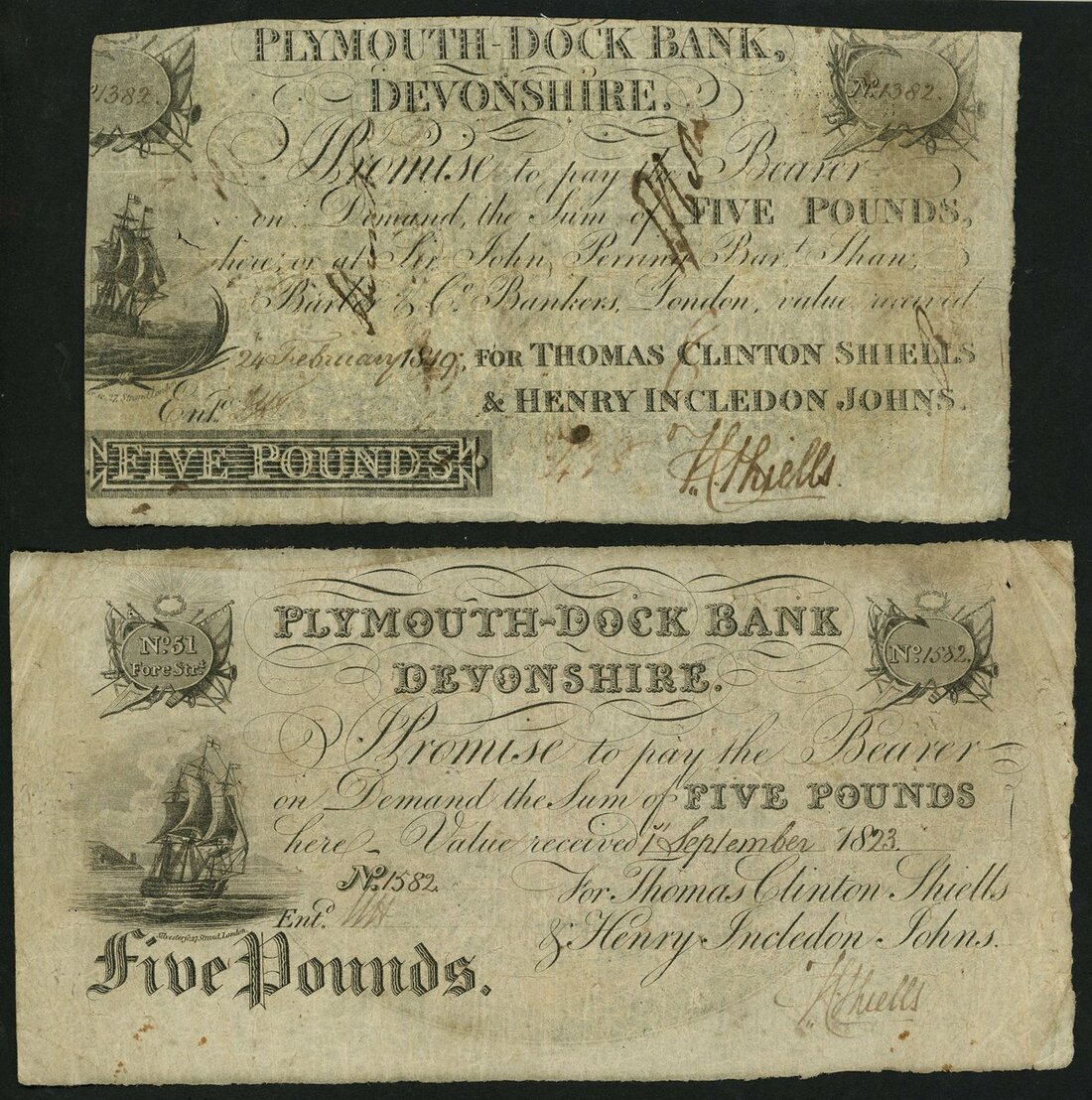 Plymouth Dock Bank, (Thos. Clinton Shiells & Henry Incledon Johns), £5 (2), 1819, 1823, two different varieties with the same signatures,