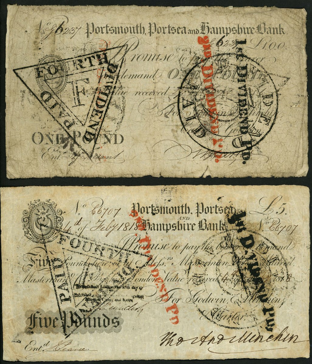 Portsmouth, Portsea and Hampshire Bank, (Gowdin, Minchin & Carter), £1, £5, 1818, (Outing 1742e, g), both with multiple dividend stamp, pinholes, fine (2 notes)