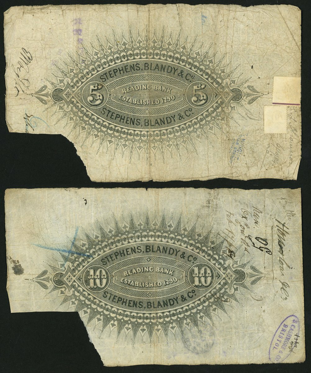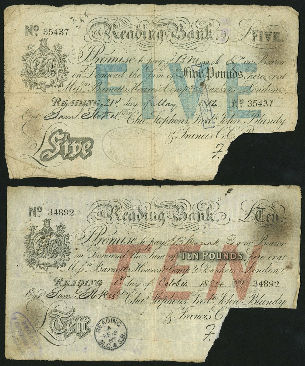 Reading Bank, (Chas. Stephens, Fred. John Blandy & Francis), £5, £10, 1884, (Outing 1769d, f), both cut cancelled, very good (2 notes)