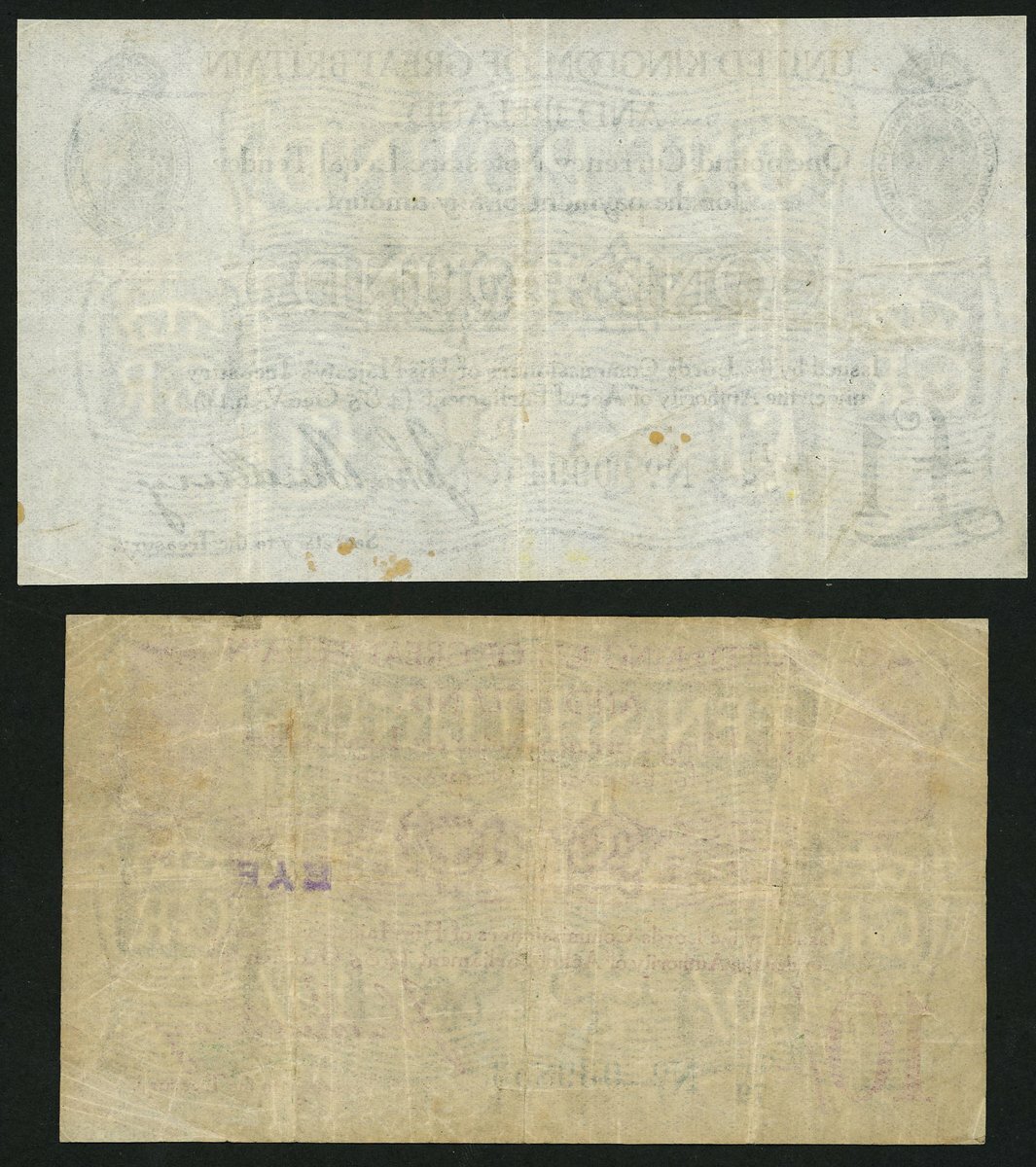 Treasury Series, John Bradbury, £1, ND (1914), serial number J1/58 09945, also a 10 shillings, ND (1915), serial number T1/79 039853,