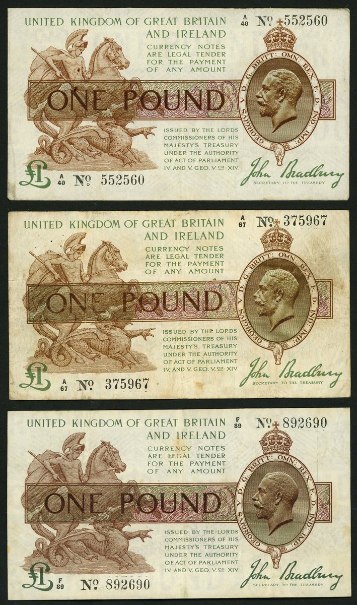 Treasury Series, John Bradbury, £1 (3), ND (1917), serial number A, F, (EPM T16), A first prefix. Both A prefix notes with pinholes, all very fine (3 notes)