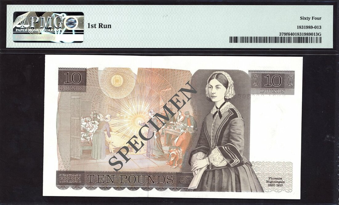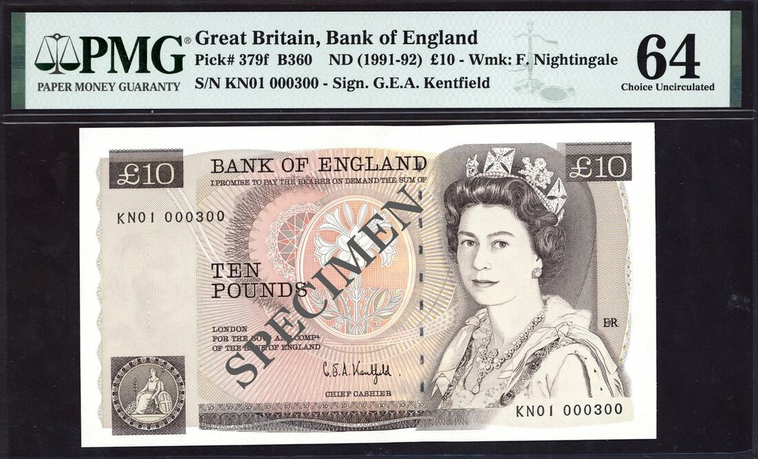Bank of England, G E A Kentfield, £10, ND (1991-92), serial number KN01 000300, brown on multicolour, portrait Queen Elizabeth II at right, seated Britannia low left, reverse, Florence Nightingale
