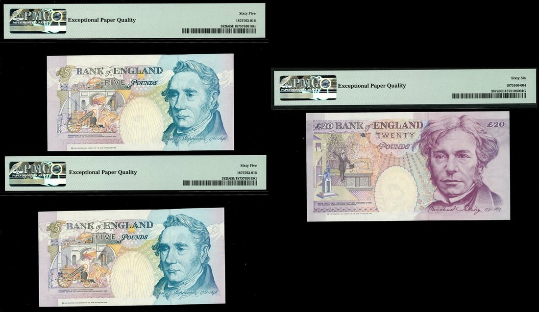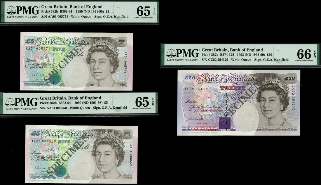 (x) Bank of England, G.E.A. Kentfield, £5 (2), £20, ND (1993-94), prefixes AA01, CC52, (EPM B363, B375, Pick 382b, 387a), in PMG holders 65 EPQ, 66 EPQ Gem Uncirculated (3 notes)
