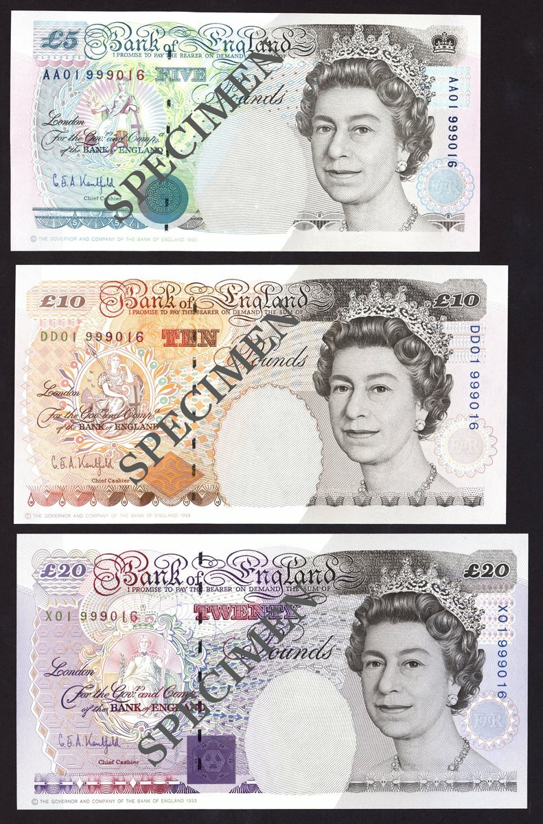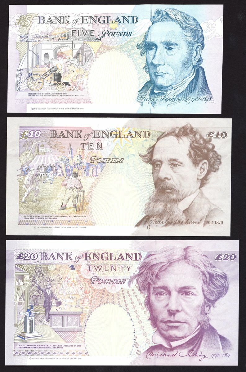 Bank of England, G.E.A. Kentfield, £5, £10, £20, ND (1993), matching serial numbers 999016, (EPM B363, B369, B374), uncirculated (3 notes)
