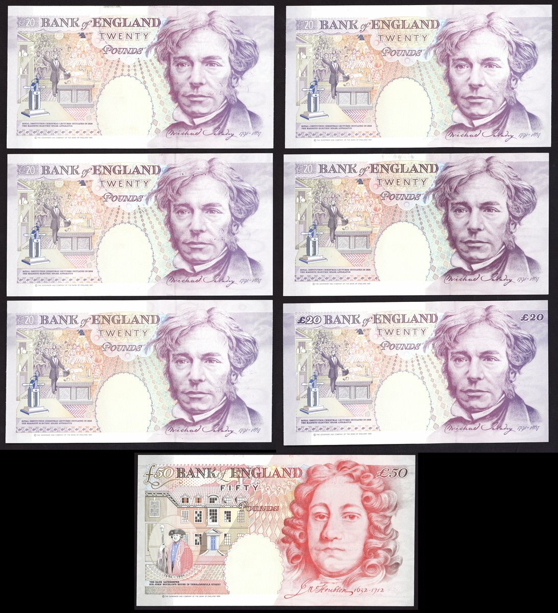 Bank of England, G.E.A. Kentfield, £20 (6), ND (1991), and a column sort £50, prefix H91,
