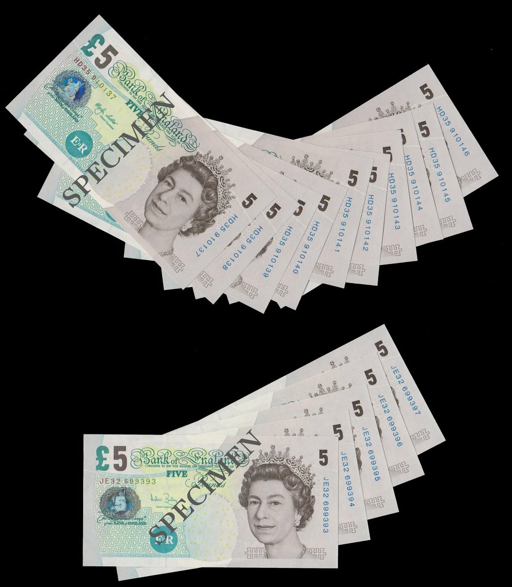 (x) Bank of England, M. Lowther, consecutive run of £5 (10), ND (2002), prefixes HD35, also Bailey, a run of five £5, prefix JE32,