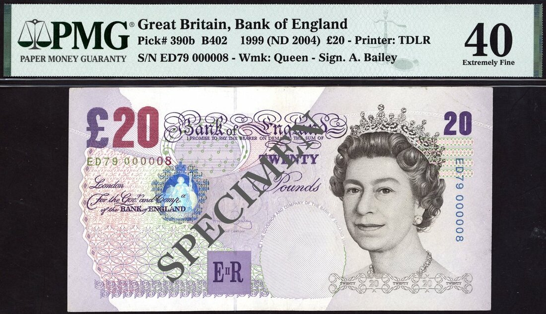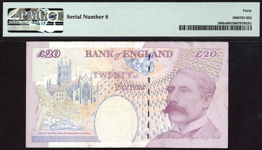 Bank of England, A Bailey, low serial number £20, 1999, (ND 2004), serial number ED79 000008, purple and multicolour, portrait Queen Elizabeth II at right, bank title top centre, seated Britannia centre left, reverse, Sir Edward Elgar