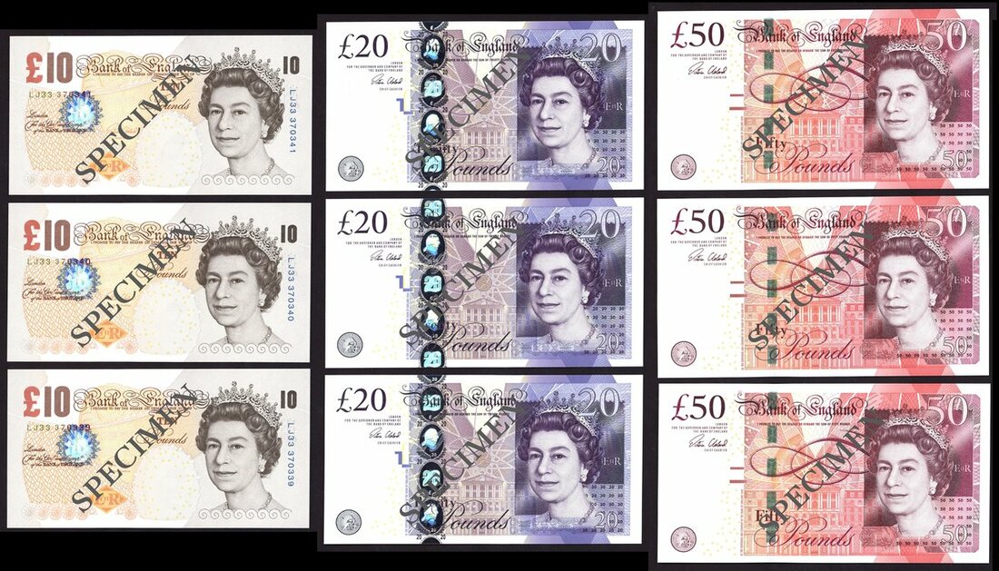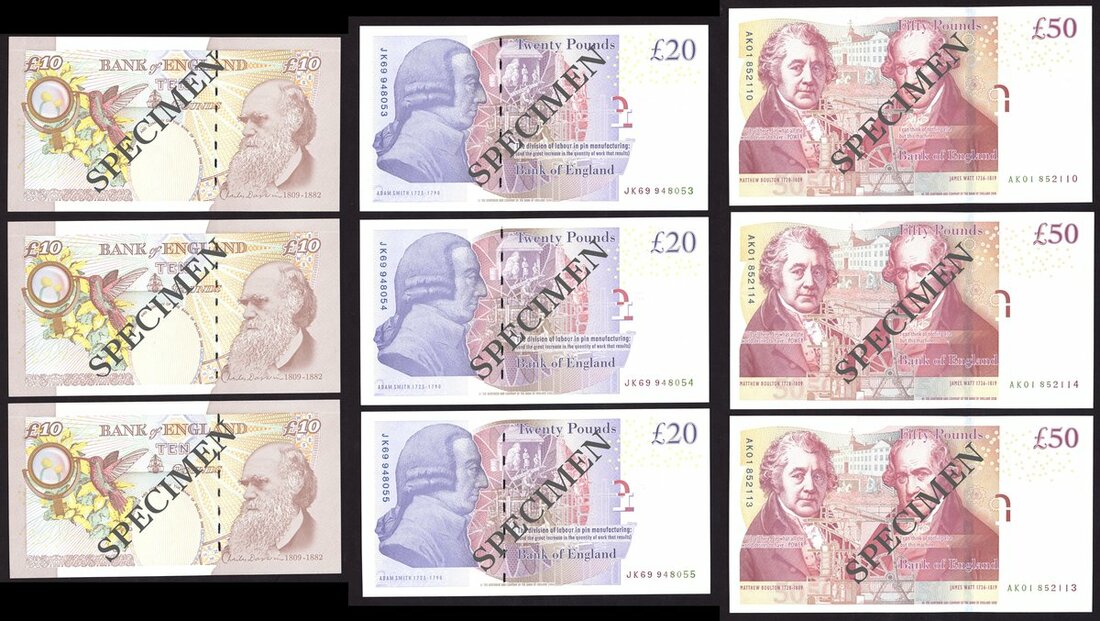 Bank of England, V. Cleland, a group of consecutive £10 (3), £20 (3), and £50 (3), ND (2015), prefixes LJ33, JK69, AK01, (EPM B411, B412, B413), uncirculated (9 notes)