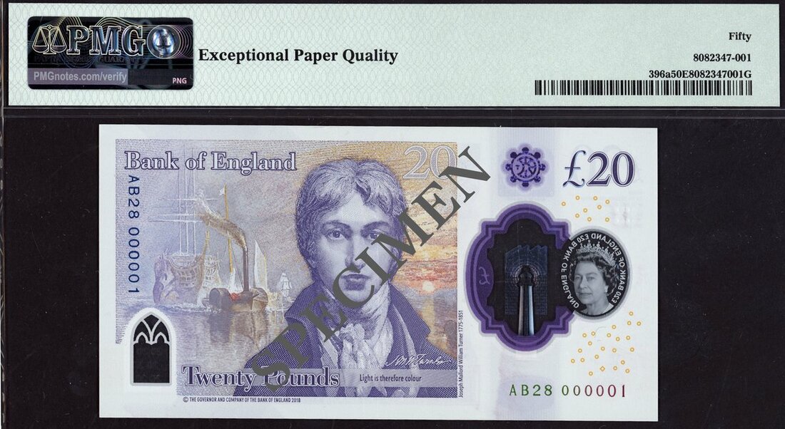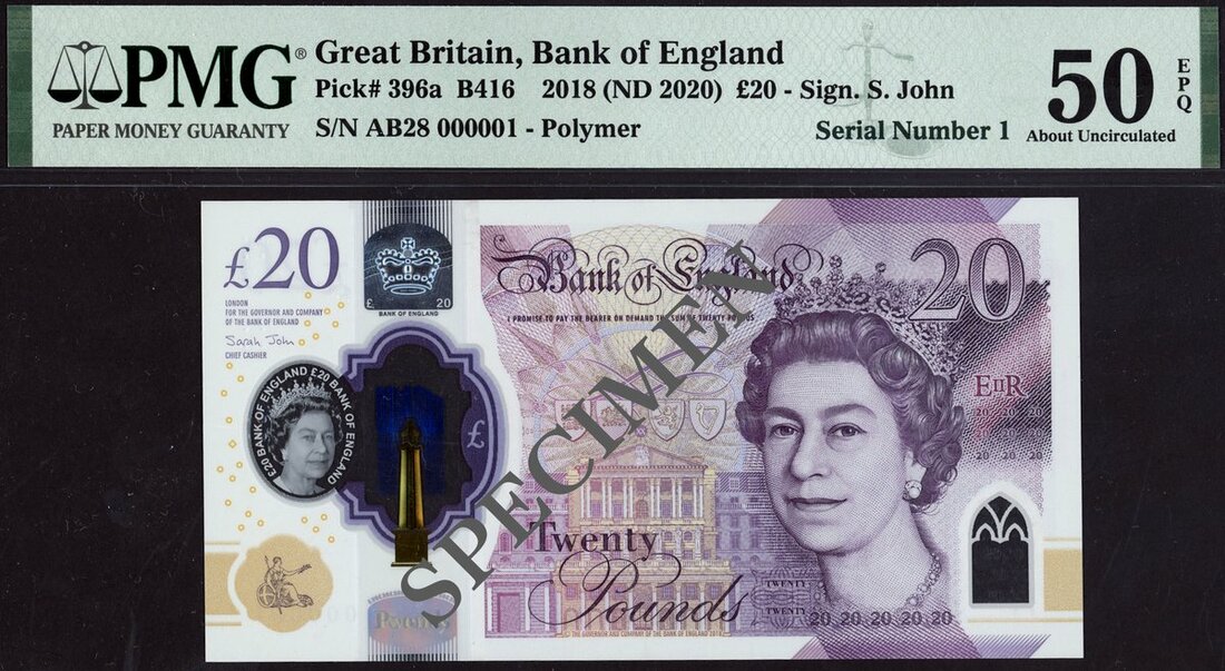 Bank of England, S. John, £20, ND (2020), serial number AB28 000001, (EPM B416, Pick 396a), in PMG holder 50 EPQ About Uncirculated. Number 1 note!