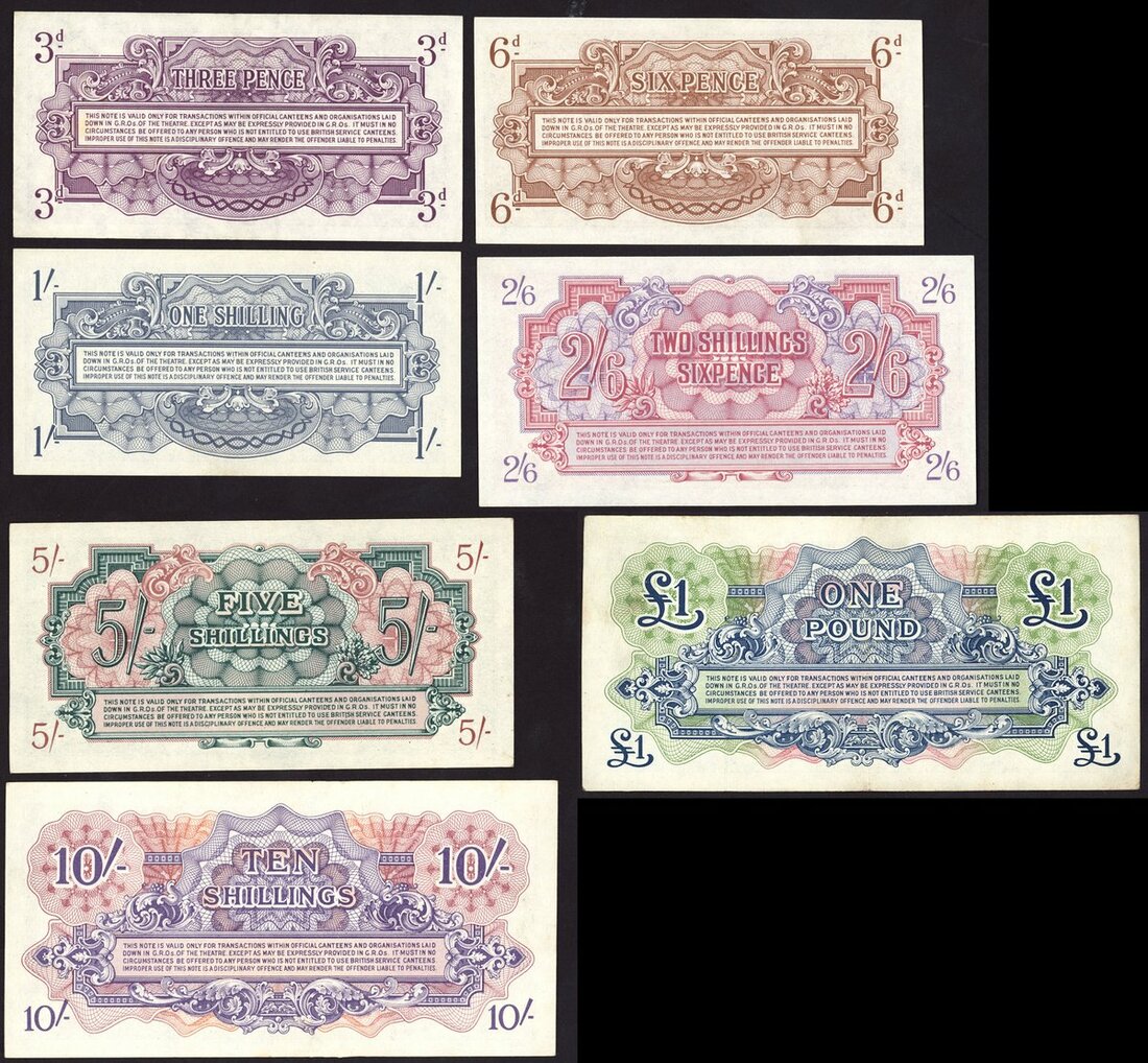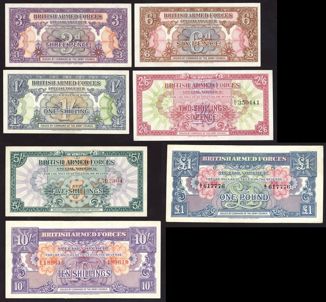 British Armed Forces, a complete set of 1st Series, including 3 and 6 pence, 1/-, 2/6-, 5/-, 10/- and £1, (Pick M9-M15), 10/- and £1 pressed, extremely fine, others about uncirculated (7 notes)