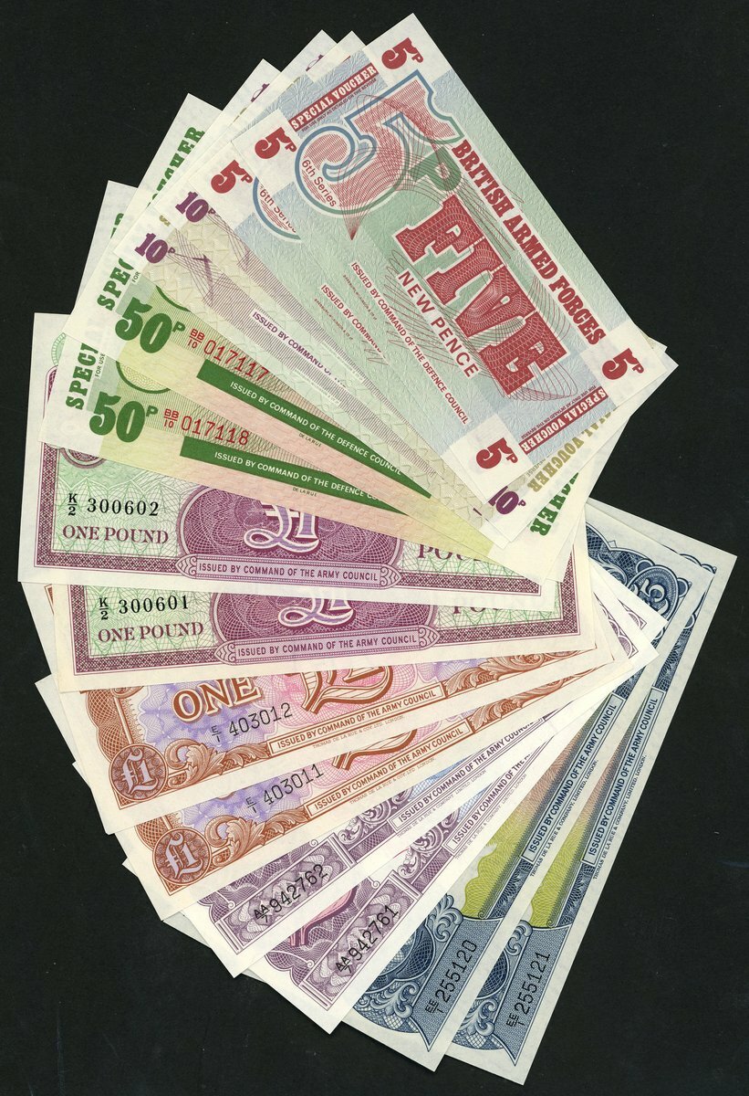 British Armed Forces, 2nd series, £1 (2), £5 (2), 3rd series, £1 (2), 4th series, £1 (2), 6th series, 5p (2), 10p (2), 50p (2), Somerset £1, prefix CU70, CX61,