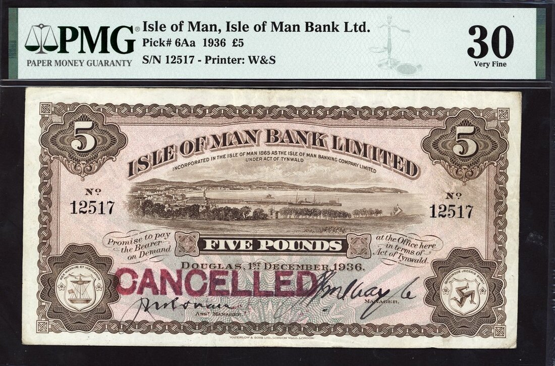 Isle of Man, Isle of Man Bank Limited, £5, 1 December 1936, serial number 12517, brown on pink underprint, view of Ramsey Bay upper-centre and values to upper corners, arms to lower corners, reverse arms at centre flanked by values contained within ornamental guilloches
