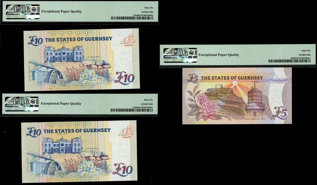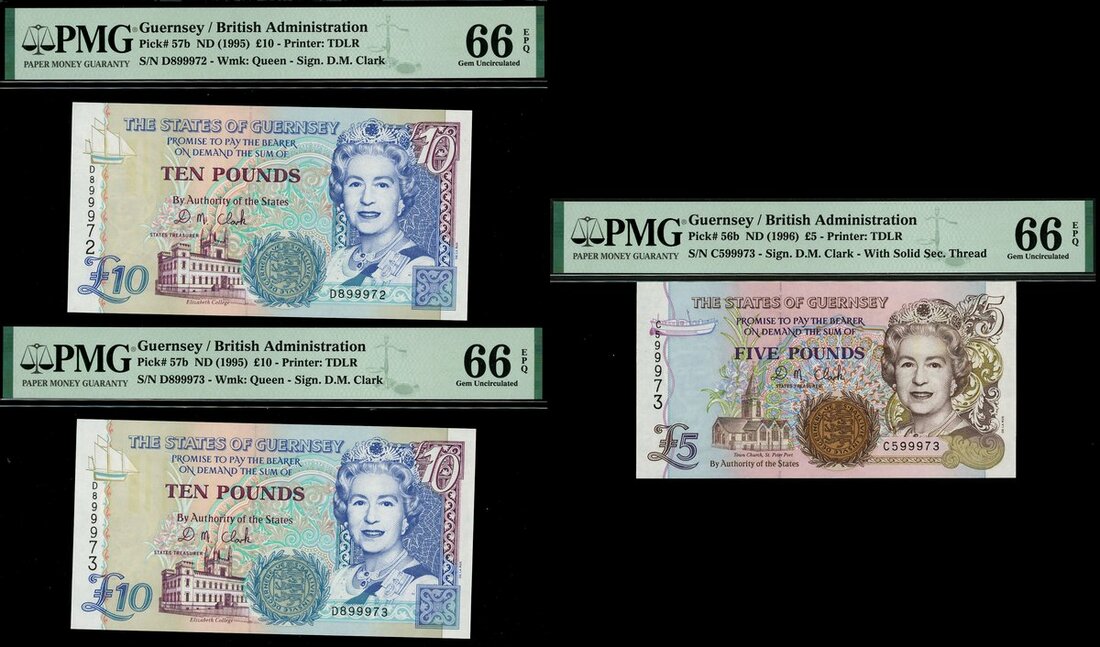 (x) States of Guernsey, consecutive pair of £10 (2), ND (1995), prefix D, also a £5, ND (1996), prefix C,