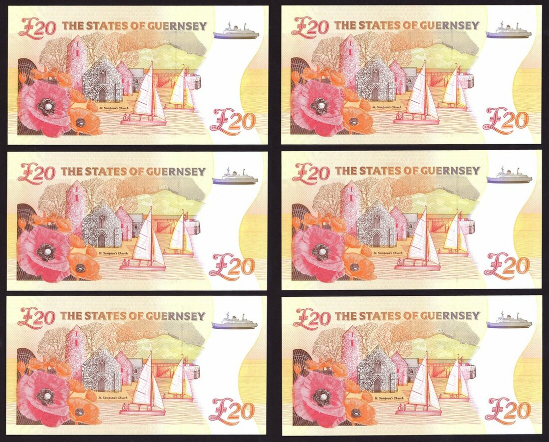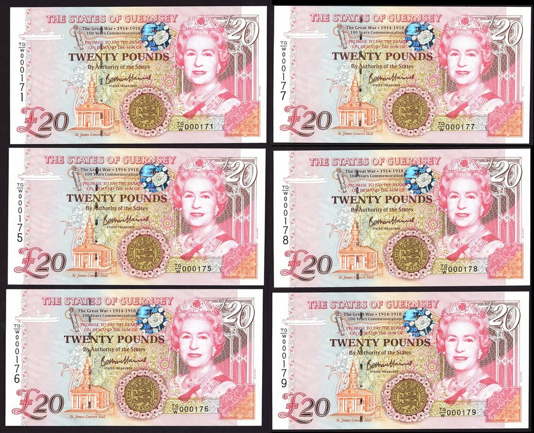 (x) States of Guernsey, consecutive £20 (5), 1996, serial numbers TG/W 000175/76/66/78/79, also a £20, 1996,