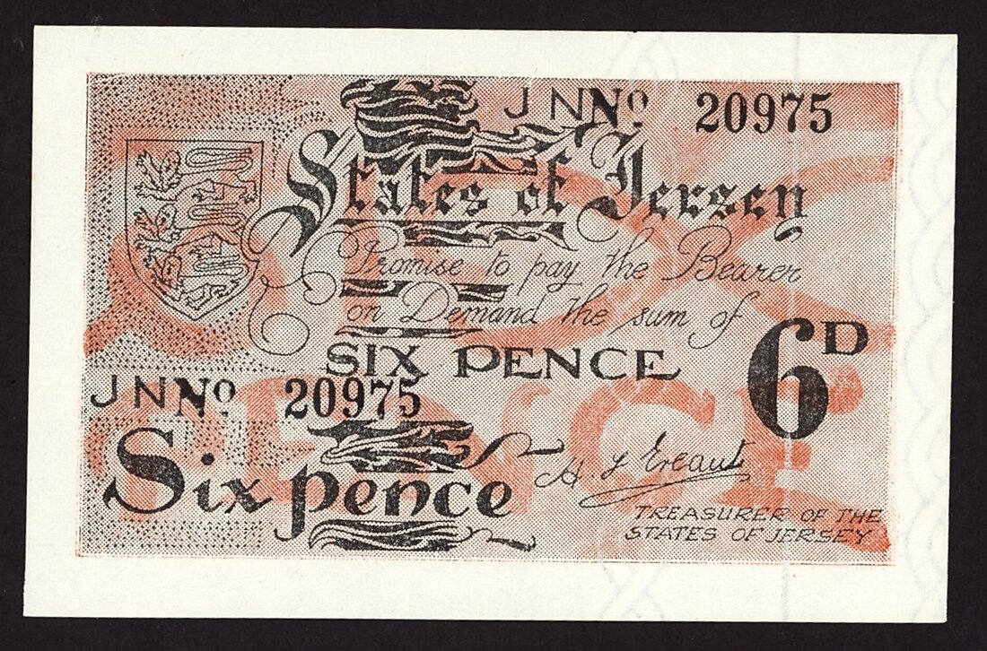 (x) States of Jersey, 6 pence, ND (1942-45), serial number 20975, (Banknote Yearbook JE1, Pick 1a), original, about uncirculated