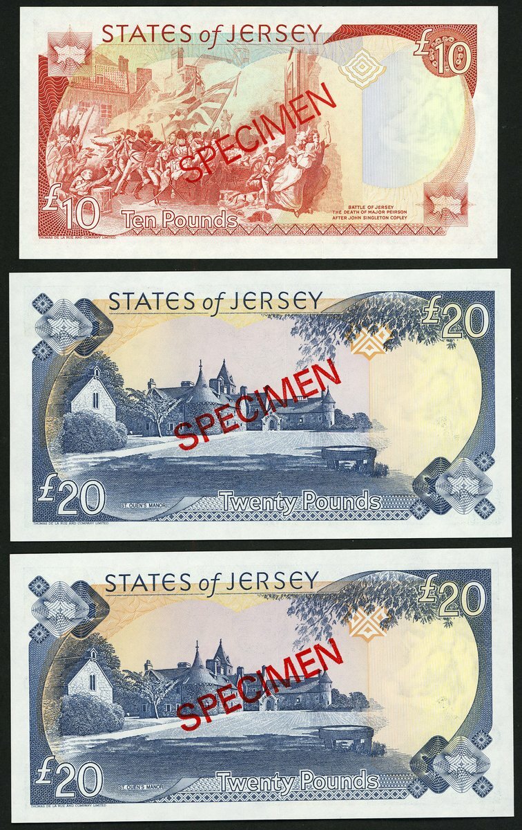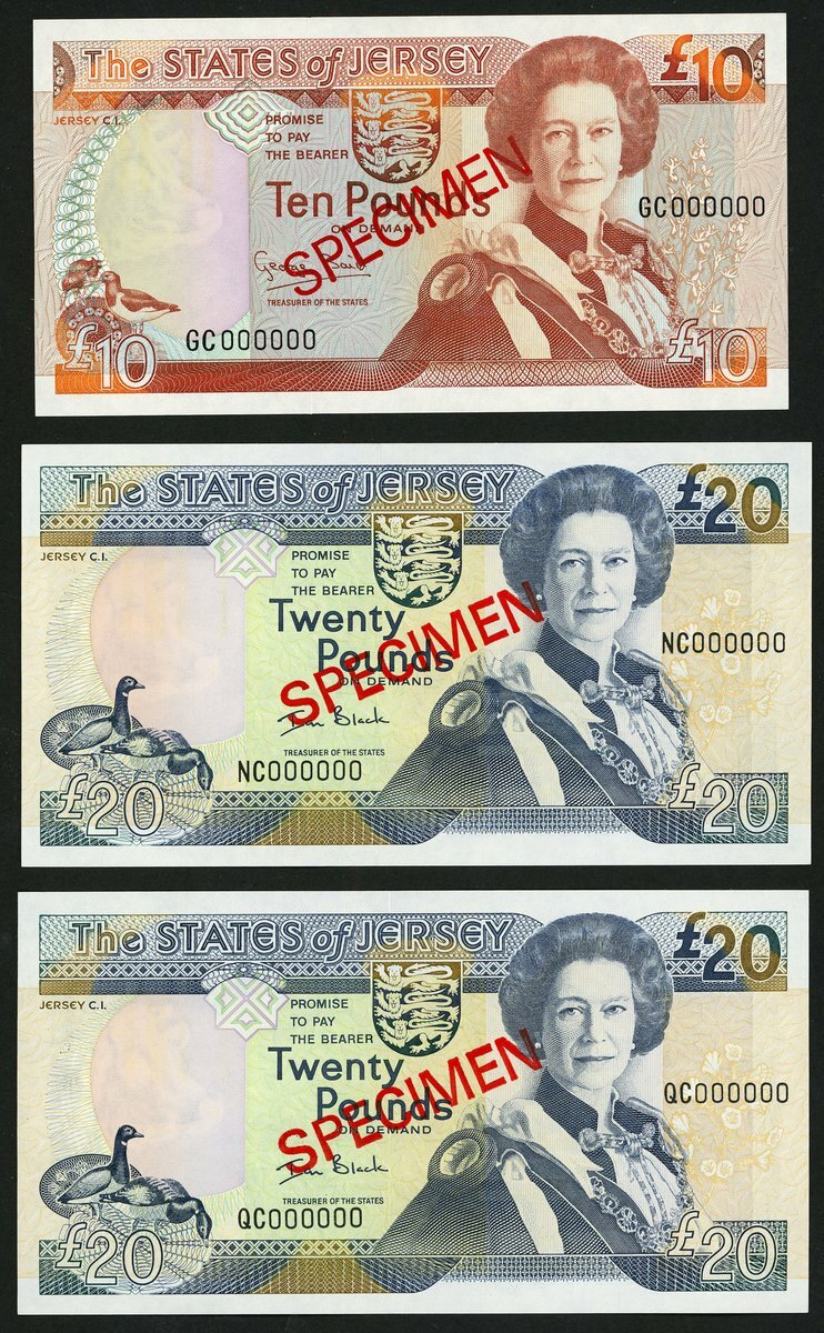 (x) States of Jersey, specimen £10, £20 (2), ND (1993-2009), prefixes GC, NC, QC, (Pick 22s, 29s), uncirculated (3 notes)