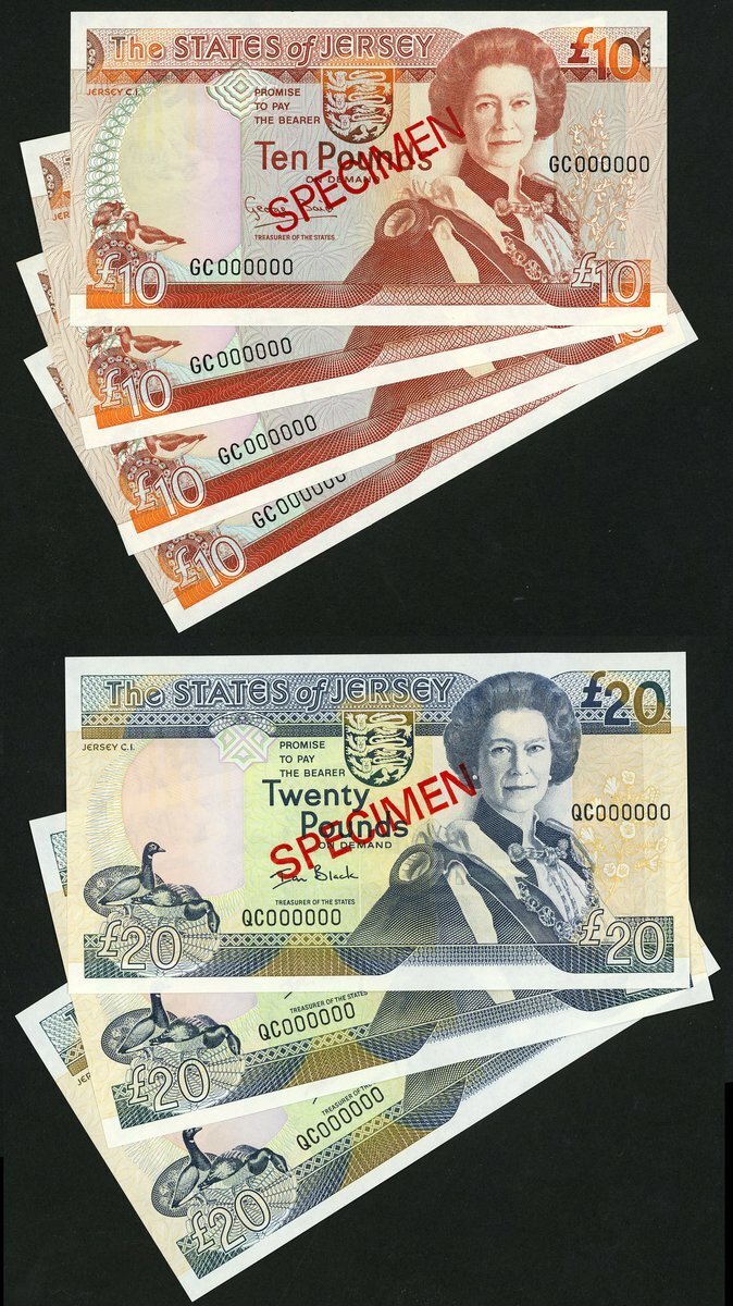 (x) States of Jersey, specimen £10 (4), £20 (3), ND (1993-2009), (Pick 22s, 29s), uncirculated (7 notes)