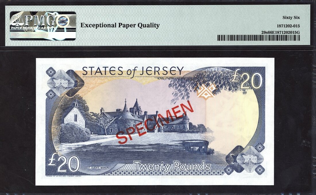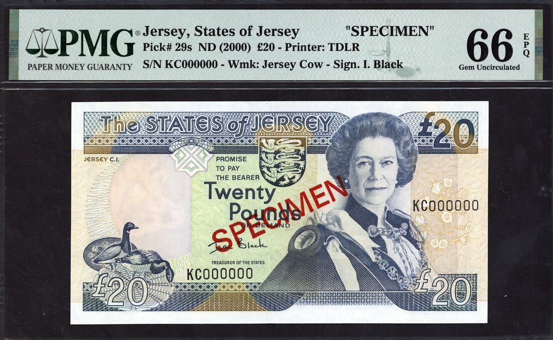(x) States of Jersey specimen £20, ND (2000), (Pick 29s), in PMG holder 66 EPQ Gem Uncirculated