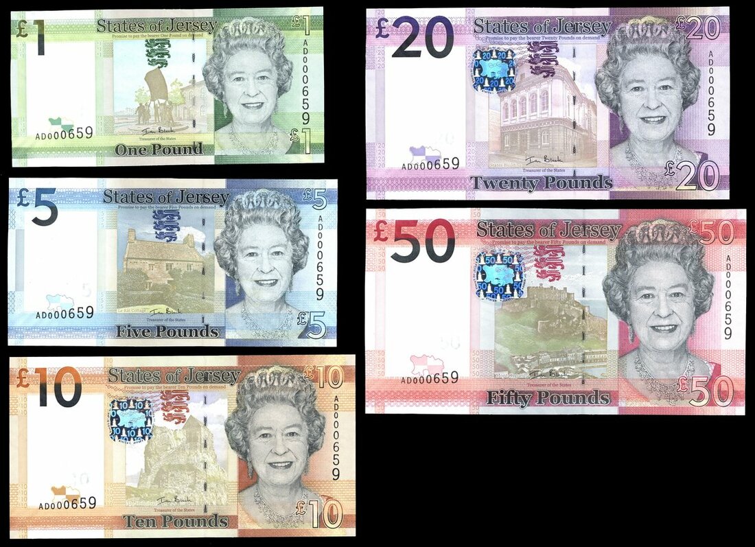 States of Jersey, a set of the 2010 issue, including £1, £5, £10, £20, £50, matching serial numbers AD 000659, (Pick 32-36, TBB B127a-131a), uncirculated (5 notes)