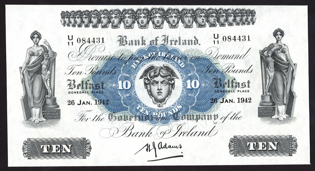Bank of Ireland, Northern Ireland, £10, 26 January 1942, serial number U/11 084431, (Pick 53b, PMI BA102), pressed, extremely fine