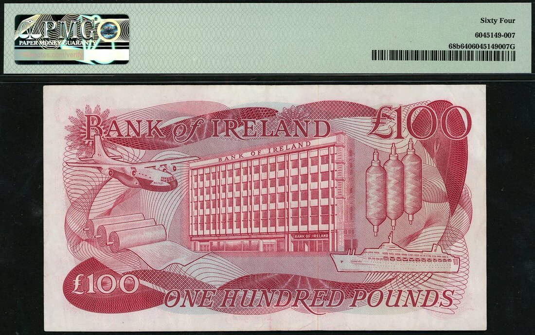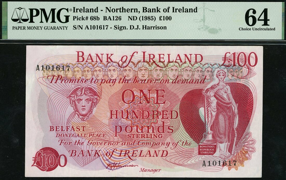 (x) Bank of Ireland, Northern Ireland, £100, ND (1985), serial number A101617, (PMI BA126, Pick 68b), in PMG holder 64 Choice Uncirculated