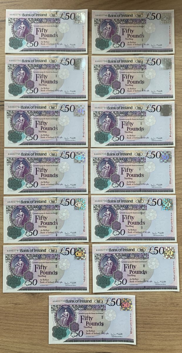 (x) Bank of Ireland, £50 (13), 1 January 2013, prefix AA, (Pick 89, TBB B135), two consecutive runs, uncirculated (13 notes)