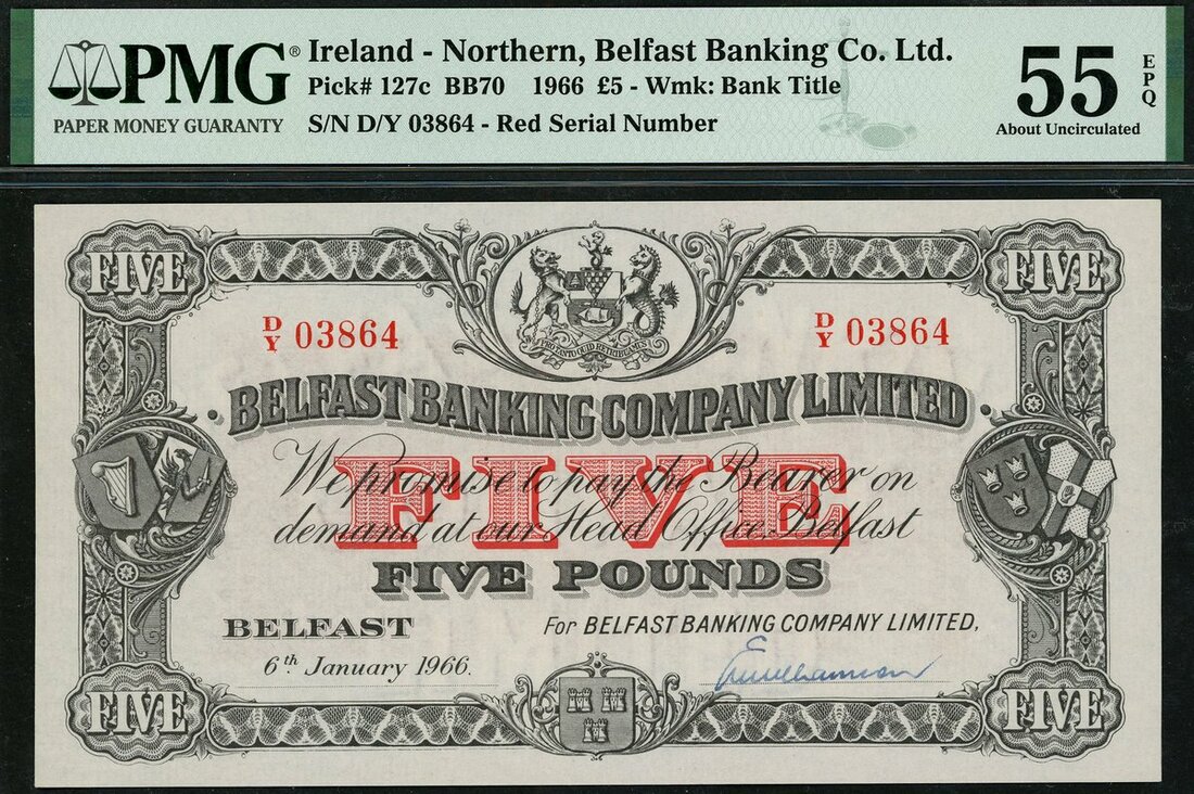 (x) Belfast Banking Company Limited, Northern Ireland, £5, 6 January 1966, serial number D/Y 03864, (PMI BB70, Pick 127c), in PMG holder 55 EPQ About Uncirculated