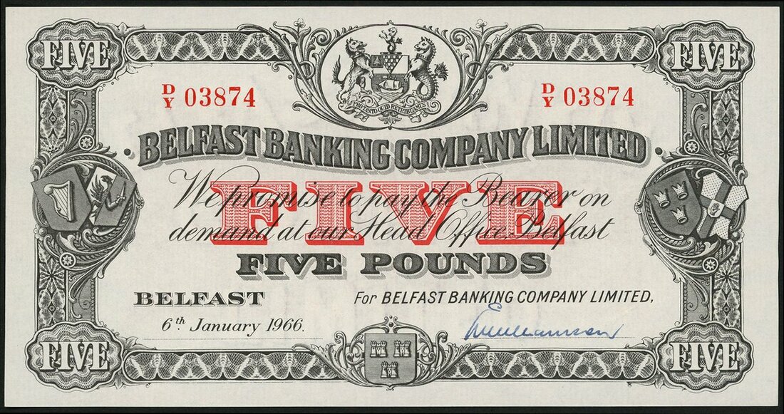 (x) Belfast Banking Company Limited, Northern Ireland, £5, 6 January 1966, serial number D/Y 03874, (PMI BB70, Pick 127c), about uncirculated