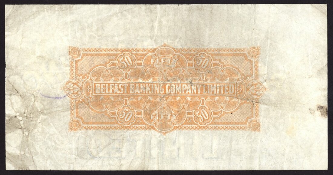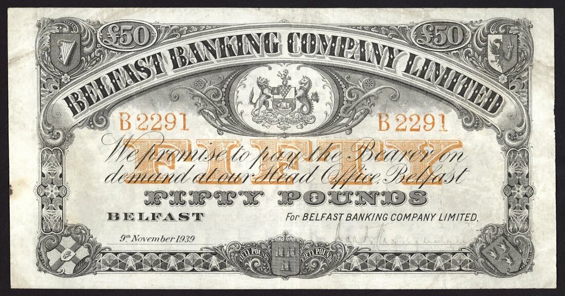 Belfast Banking Company, £50, 9 November 1939, orange serial number B2291, black and white, value in orange at centre, arms top centre, manuscript signature low right
