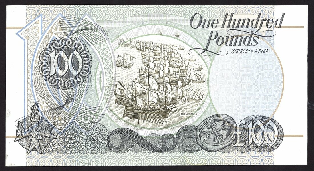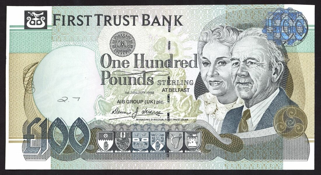 First Trust Bank, Northern Ireland, £100, 1 January 1998, serial numbers omitted, olive green and grey on multicolour underprint, man and woman at right, bank title top centre left, coats of arms low centre, reverse, illustration of the Armada,