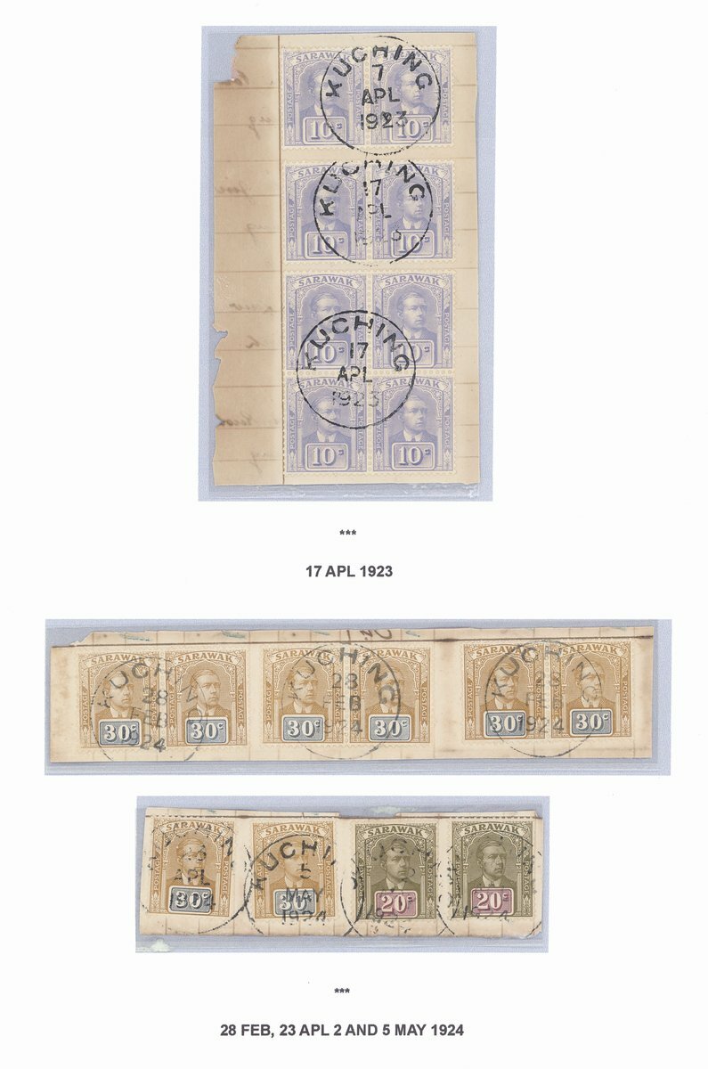 1918 10c. blue block of four and two pairs on piece cancelled by Kuching c.d.s. for 17 April 1923; 1918 20c. olive and violet (2) and 1922 30c. ochre-brown and slate (2) on piece cancelled by Kuching c.d.s. for 23 April, 2 and 5 May 1924; and 1922 30c. ochre-brown and slate pairs (3) on piece cancelled by Kuching c.d.s. 28 February 1924. A scarce lot