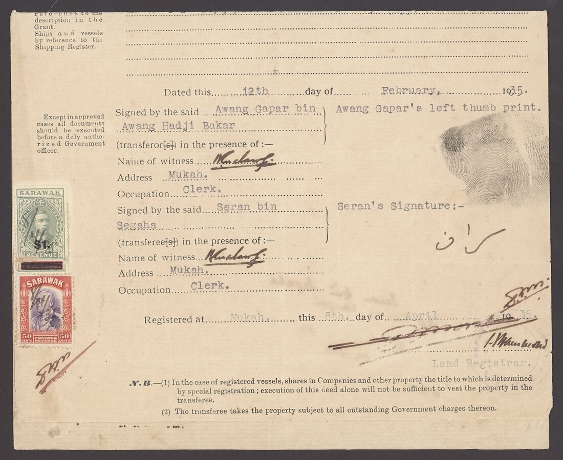 1935 (12 Feb.) Deed of Transfer for a sago garden at Sungai Mukah, bearing $1 on $3 (damaged) in combination with Postage 1934 50c., both crossed by manuscript date. Scarce