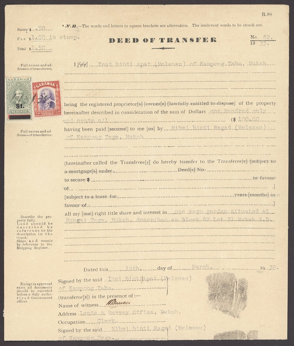 1935 (19 Mar.) Deed of Transfer for a Sago garden at Mukah valued at $55, bearing $1 on $3 in combination with Postage 1934 30c., both crossed by manuscript date, fine. Scarce