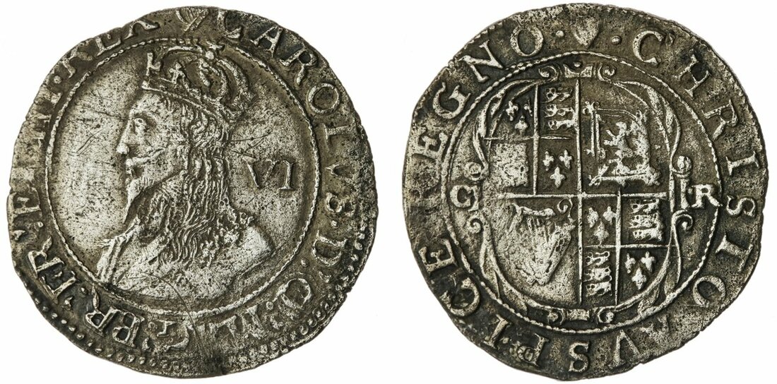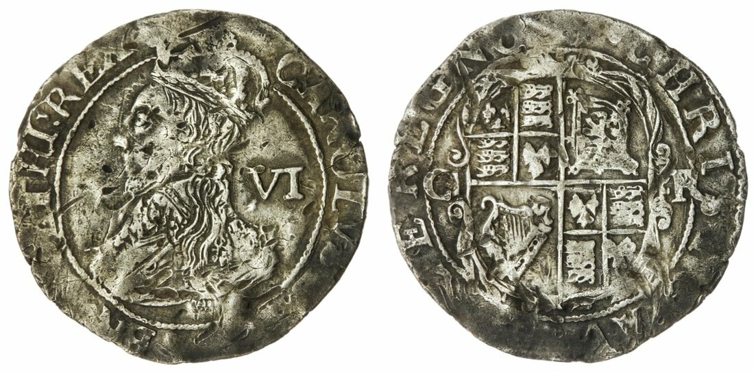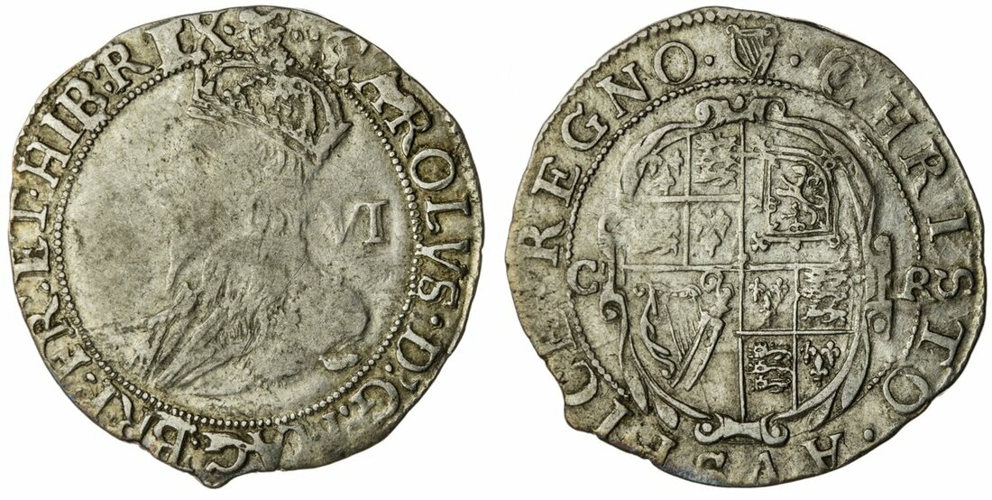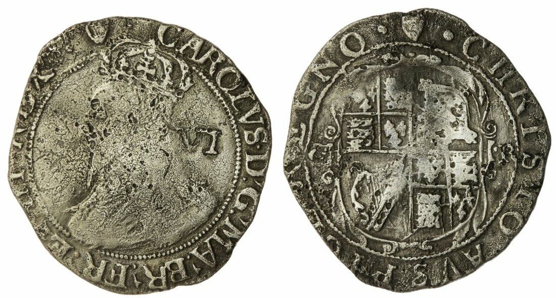 The Frank Viles Collection of Sixpences | Charles I (1625-1649), Sixpences, 1632-1633, Group D, type 3, Tower (under King) (4), small fourth bust, not breaking inner circle, reads MAG.' BR.' FR.' ET HI.', rev. oval-garnished shield, dividing cypher, 2.92g, 10h, m.m. harp (Spink 2811; North 2240; cf. Brooker 604-605, legend as 608), porous from past soil deposition, struck details otherwise bold, a bold fine; another, medium head, reads MAG,' BR.' FR.' ET HIB.', rev. as last, stops in legend, 3.00g, 10h (Spink 2811; North 2240; cf. Brooker 605), a flatter fine; another, large head, breaking inner circle, reads MA.' BR.' FR.' ET HI,', as before, 2.82g, 6h (cf. Brooker 608), creased and porous flan, poor to good; lastly, large head, reads ...ET HI.' (Spink 2811; North 2240; Brooker 608), dented and crimped, toned, fine (4)