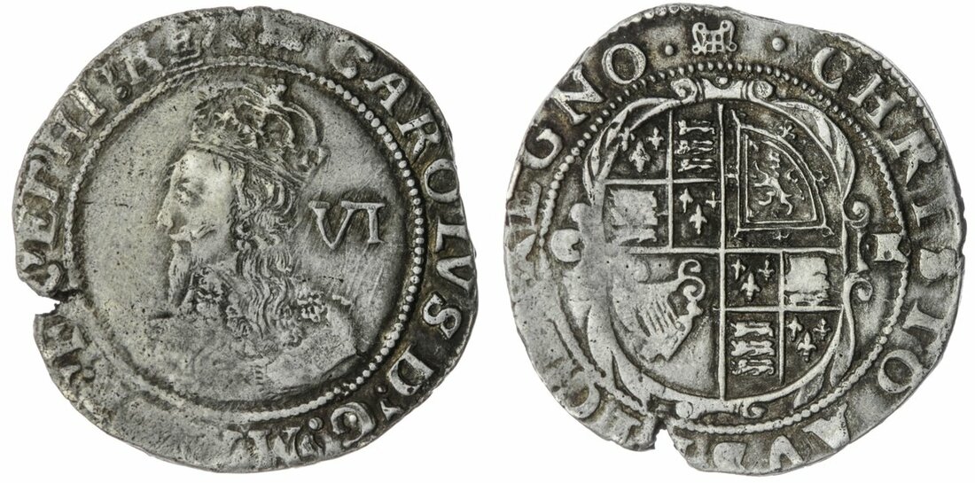 The Frank Viles Collection of Sixpences | Charles I (1625-1649), Sixpence, 1633-1634, Group D, type 3, Tower (under King), small fourth bust, reads, MA.' BR.' FR.' ET HI.', rev. oval-garnished shield, dividing cypher, 2.88g, 9h, m.m. portcullis (Spink 2811; North 2240; Brooker 611), small flan split and softly struck to periphery, otherwise toned, good fine, scarce