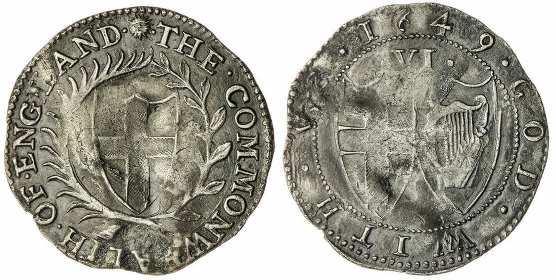 The Frank Viles Collection of Sixpences | Commonwealth (1649-1660), Sixpence, 1649, 2.93g, 9h, m.m. sun [on obv. only] (Spink 3219; North 2726; ESC 177 [1483]), creased scruffy from past soil deposition, otherwise struck details almost very fine, a popular seminal date of issue