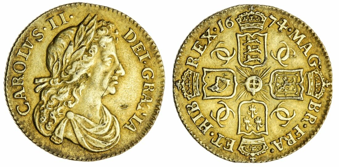 The Frank Viles Collection of Sixpences | Charles II (1660-1685), Sixpence, 1674 (Spink 3382; ESC 566 [1512]; Pywell-Phillips 74), scratches on obverse and contemporaneously gilt to pass off as a Half-Guinea, a bolder very fine